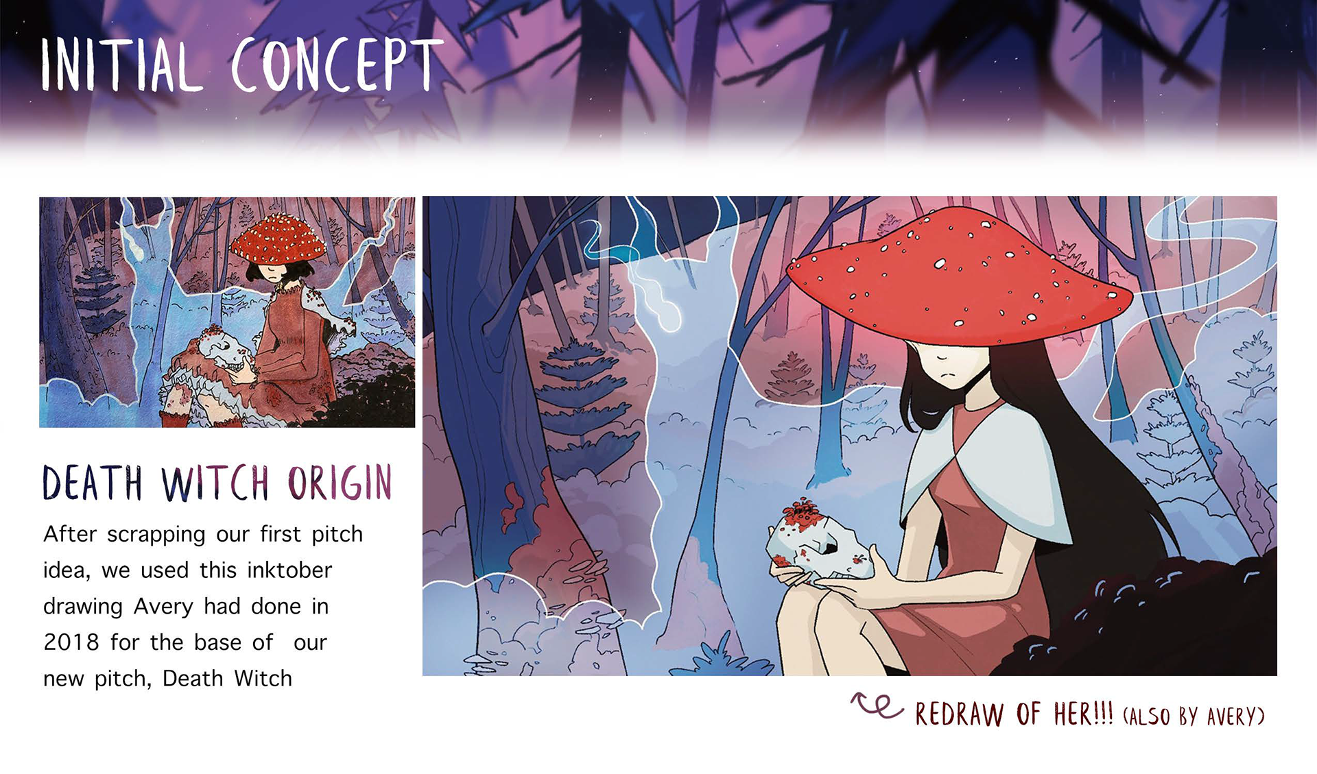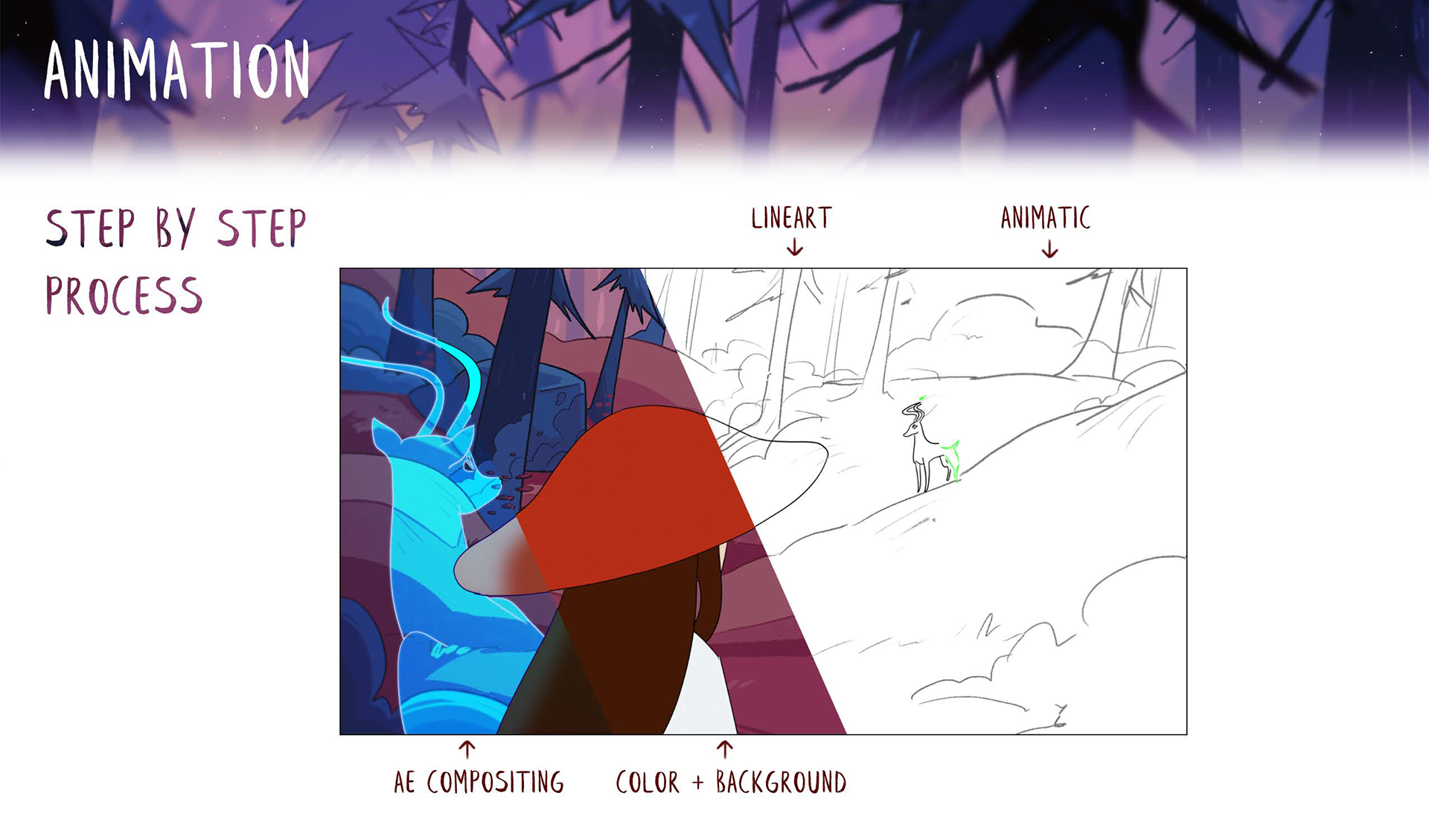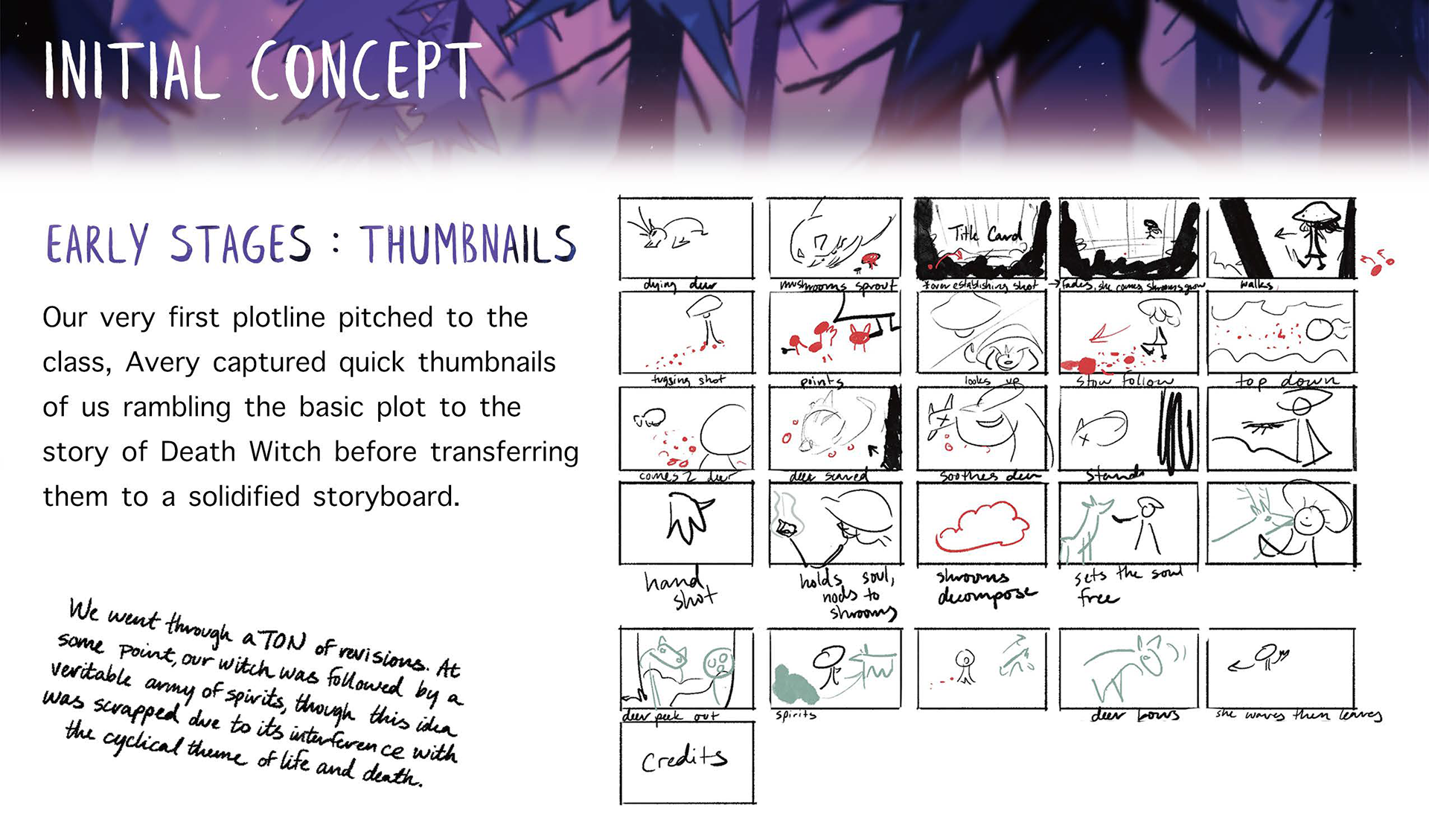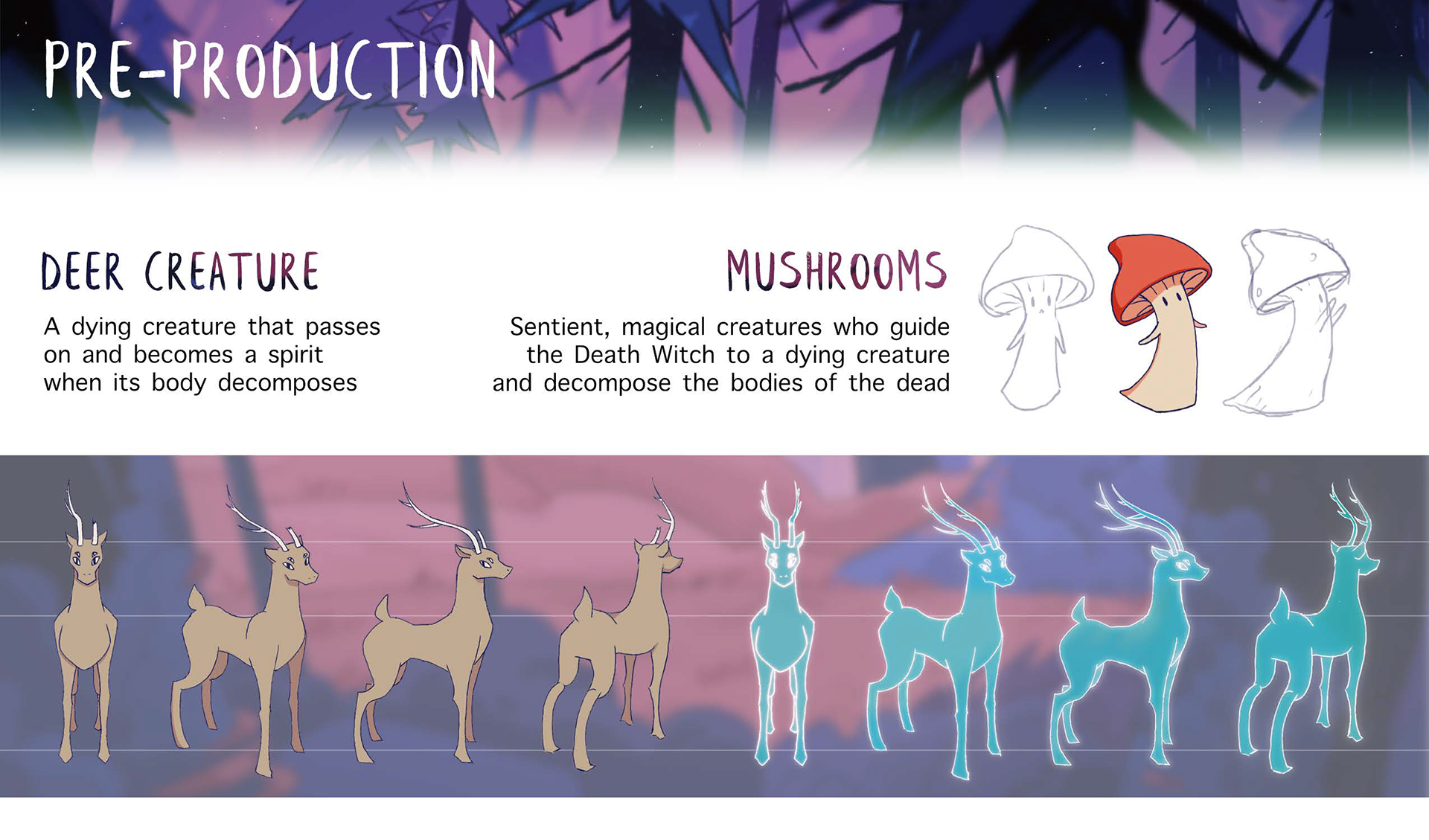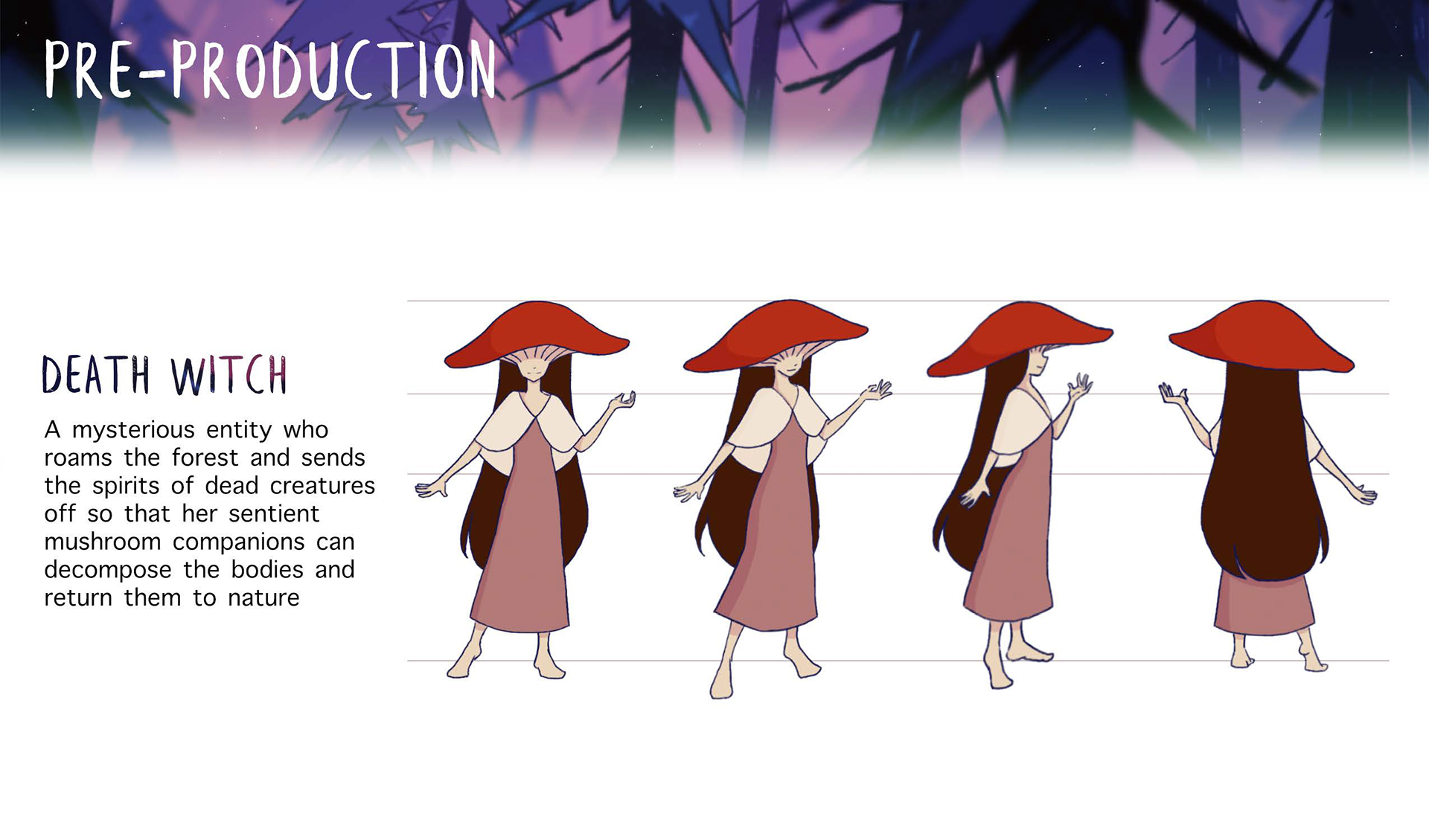 Death Witch is a 2D animated short film created by Kyra Suder, Avery Hall, and Emily Park. Through slow, implicit motion and immersive environments, Death Witch allows one to take in the serene beauty of nature and contrast it with the grotesque circle of life.